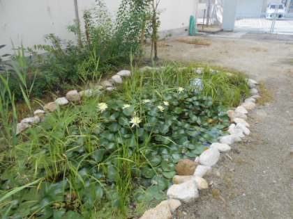 管理作業員さんがビオトープを整備して、ずいぶんキレイになりました。最近では、睡蓮の花が咲いています。睡蓮の花は午前中にしか見ることができないそうです。