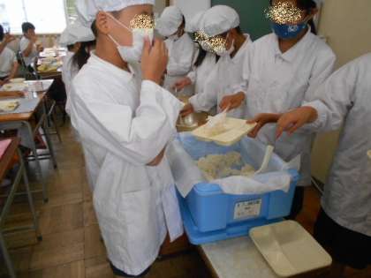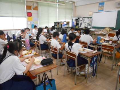 高学年の給食は、配膳や盛り付けなどの手際もよく、短時間で準備することができます。しっかりおかわり(増やし)もして、暑い中でも完食です。