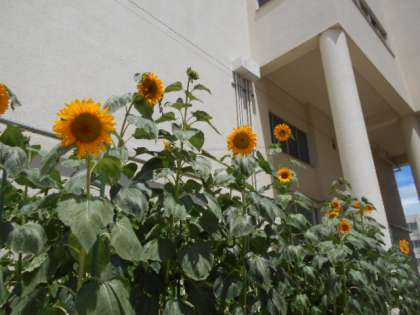 いよいよ今日から夏休みですね。いつもと違い、静かな校舎を回っていると、夏休みに入ったんだと感じられます。ふと学習園を見ると、ド根性ヒマワリが元気よく咲いていました。夏の暑さにも負けず、輝くように咲いている姿が印象的です。