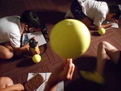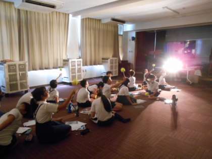 蛍光塗料をぬったボールを使って、自分自身が地球になります。そこへ太陽の光(ライト)を当てると、どんな月の形が見えたのでしょうか。天体はなかなか分かりにくい単元ですが、体験を通して、興味関心が湧くといいですね。