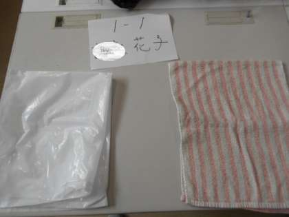 材料 使い古したバスタオル、45リットルのゴミ袋(厚め)、名前を書いた紙
