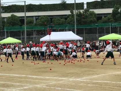 玉入れではたくさん玉が入って、赤組も白組も100個を超えていました。