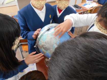 グループで地球儀を見ながら、それぞれの国を探しています。経度や緯度、日付変更線などの用語とともに、学ぶことが日本を飛び出し、外国にまで及んでいきます。