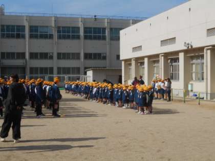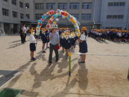 2〜6年生の在校生との「入学おめでとう集会」が開かれました。代表委員から入学おめでとうのメダルをわたした後、花道を通る1年生です。すこし緊張しているかな?