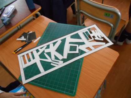 名前をデザイン化して、カッターで切り抜いています。ひらがな、カタカナ、漢字、アルファベットで進めています。
