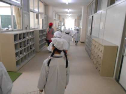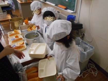 今週から自分たちで給食を取りに行き、おかずやパンを取り分けています。