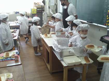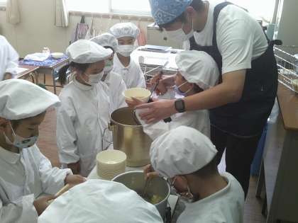 大きなお玉で、大おかずを分けています。少しずつですが、準備の時間も速くなっています。