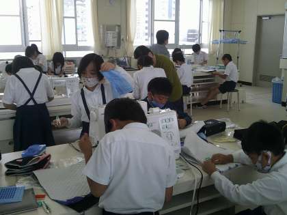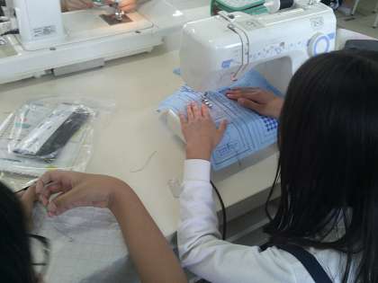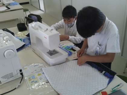 地域の方のお力を借りて、ナップザック作りに挑戦中です。慣れない手つきで、ミシンに取り組んでいます。作ったナップザックは、林間で活用する予定です。