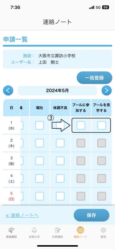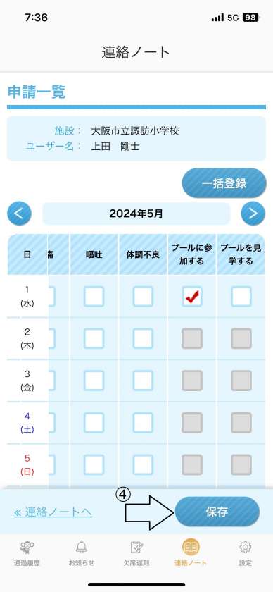 水泳指導がある日の朝に必ず体調確認を行ってから入力をしてください。なお、入力を忘れてしまい、参加かどうかの確認ができない場合、安全上の問題でプールに参加することができません。ご注意ください。