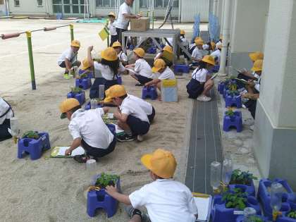 種まきしたアサガオも少しずつ大きくなってきました。今年は少しだけ成長がゆっくりでしょうか。そろそろつるが伸びてくるので、支柱を立てました。花が咲くのは、夏休みに入ることになるでしょうか。