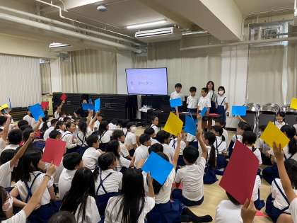 色んな国の衣服や住まい、食事などを調べて、クイズ大会を行いました。それぞれの国の特徴を知り、違いを感じることは、お互いを理解する大切なきっかけになります。