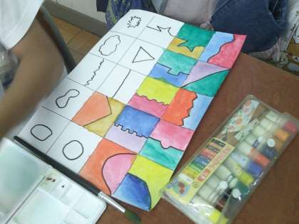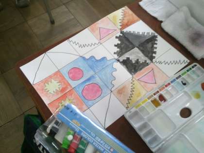 それぞれのマス目を線で分けて、色を付けています。5年生ともなると、「ぼかし」や「かすれ」など、それぞれの子どもの特徴がよく表れています。