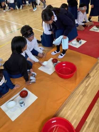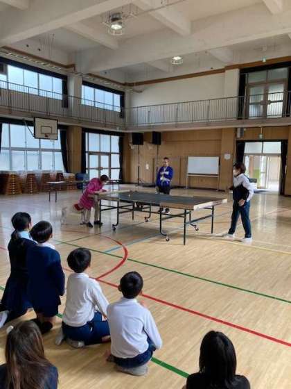 そのあとクラスごとに、盲導犬と触れ合ったり、視覚障がい者の卓球(サウンドテーブルテニス)を体験したり、目かくしをして食器を扱ったりする体験をしました。