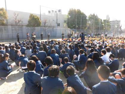 地震が発生したという想定でグラウンドに避難し、その後に津波警報が出た想定で校舎の3階以上に避難しました。