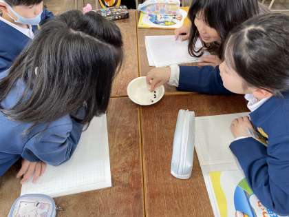ヒマワリの種に形と色が似ている。みかんを食べると、似ている種が出てきたよ。様々な角度から予想を立てていました。