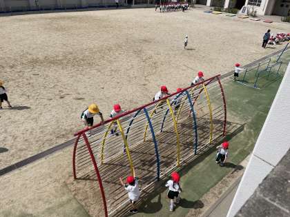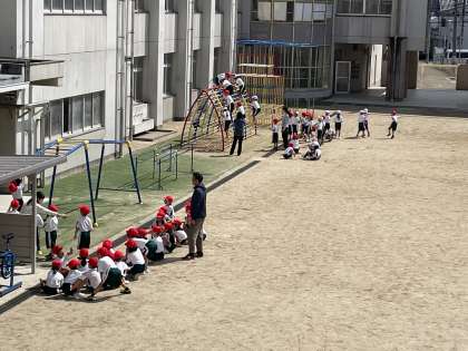お昼から気温も上がり、温かくなってきました。1年生が遊具で体育をしていました。みんな上手に登っていますね。