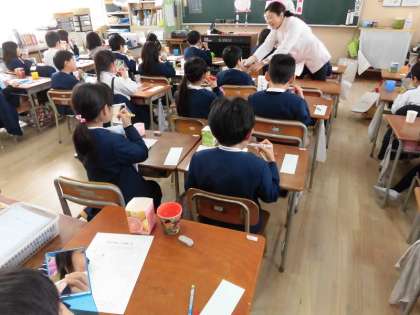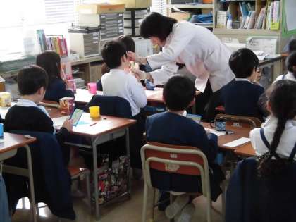 教育委員会の歯科衛生士さんや歯科校医さんに来ていただき、普段みがき残しの多いところや、正しい歯のみがき方を教えていただきました。