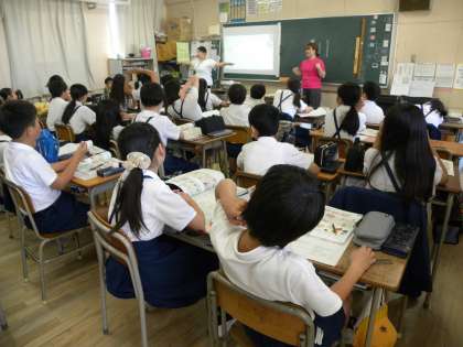 裁縫実習で手縫いの手順を学習しています。5年生では、ナップザックを手縫いとミシンを使って仕上げます。