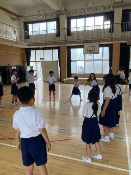 2年生と4年生でチームをつくり、ジェスチュアだけで誕生日の順に並び変えるゲームや、ゴロゴロドッカンゲームをしました。