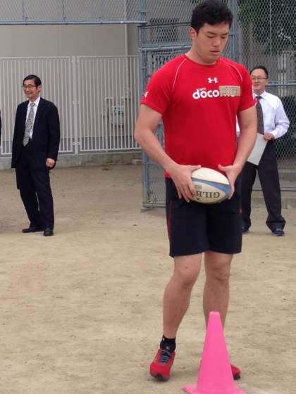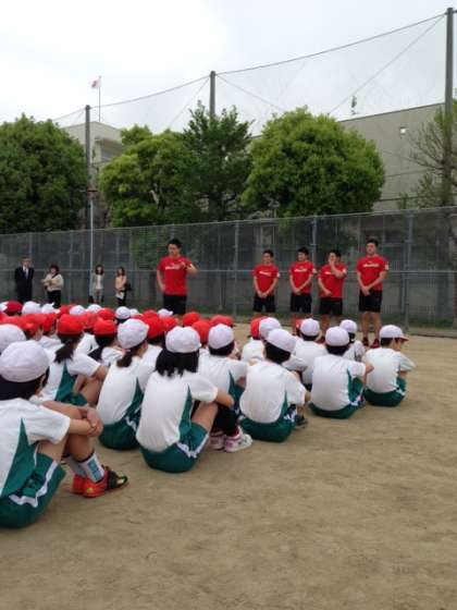 NTTドコモレッドハリケーンズの緑川 昌樹さん他4名の選手が来校され、講演と実技指導をしていただきました。大阪市スポーツ部の担当者や城東区長も見守る中、子ども達は元気いっぱいのプレーをくりひろげました。