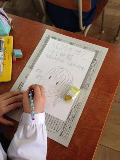 保健委員会のふだんの活動は、トイレットペーパーや手洗い石けんの補充、毎週火曜日の清潔調べなどです。今は、6月13日から始まる「ぶくぶく・ガラガラうがい週間」に向けて、準備の真っ最中です。