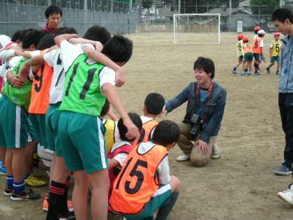 これは、サッカークラブの写真撮影風景です。写真屋さんの丁寧なアドバイスにより、前列の子どもたちは、左足の膝を立てて座ることにしました。かっこいい写真が撮れましたよ。