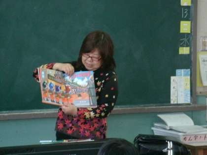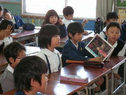 これは3年生の教室での熱演の様子です。子どもたちも聞き入っています。