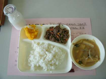 牛肉と野菜のいためもの つみれ汁 かぼちゃういろう やきのり ごはん 牛乳 *たくさんの感想をいただきました。「おいしかったです!」「想像以上に手の込んだ料理でした」「私のつみれ汁にはつみれが入っていませんでした。残念」「給食はただのお昼ごはんではなく、食べることを通して子どもがいろんなことを学んでいることを知りました」「栄養教諭の先生、ありがとうございました」