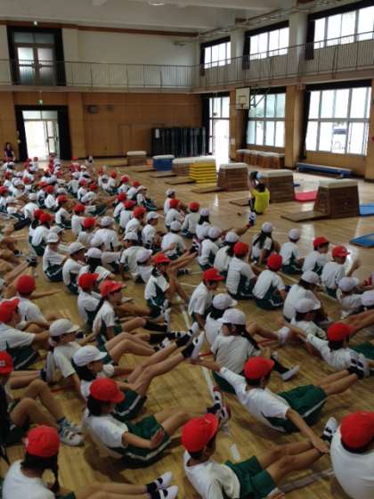最後に全校児童の前で、マット運動の模範演技を見せていただきました。