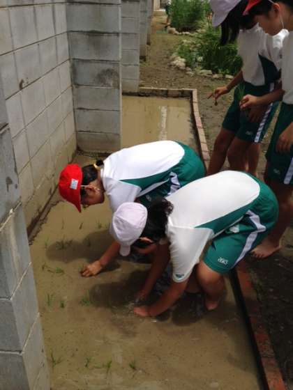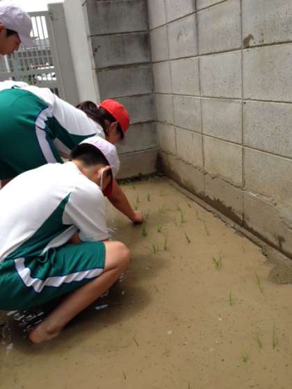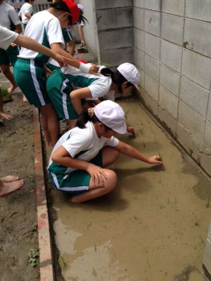 梅雨の合間をぬって、5年生が田植えをしました。精米された袋入りの米しか見たことのない子どもも多く、どのように育っていくのか楽しみにしています。