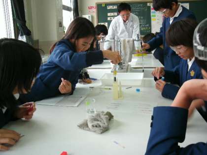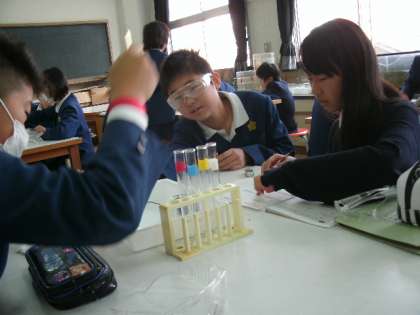 6年生の学習参観の様子です。理科の学習で「水溶液の性質」をリトマス紙で調べる実験中です。よく見ると、子どもたちはかっこいい「透明メガネ」をかけています。これは「安全メガネ」といって薬品が目に入ったりしないようにつけるのだそうです。この日調べた薬品は、食塩水、炭酸水、石灰水、水酸化ナトリウム、塩酸です。もちろん、実験は安全に終わりました。