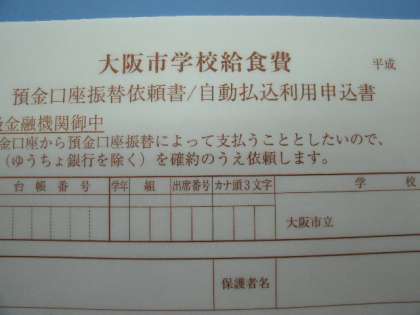 お子様を通じて「大阪市学校給食費 預金口座振替依頼書のご提出について」というお手紙を配布しました。お手元に届いているでしょうか。