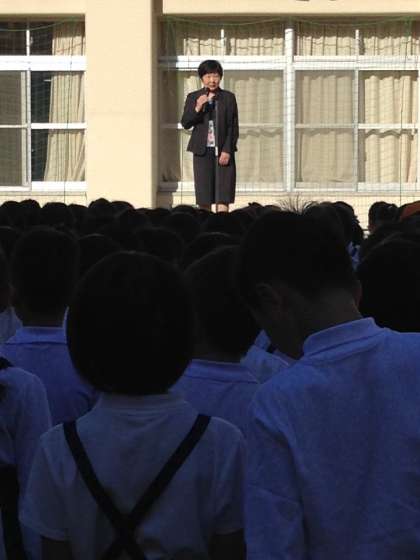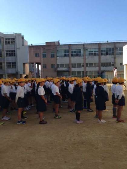 秋晴れの空の下、久しぶりに児童朝会が行われました。2学期の子ども達の様子は、とても落ち着いており、今朝も始業のチャイムより早く運動場に整列することができました。先週の地震の際も、子ども達は担任の指示に従い静かに素早く行動できました。