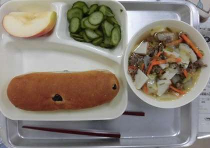 今日の献立は「肉うどん」「あっさりきゅうり」「りんご」「レーズンパン」「牛乳」です。
