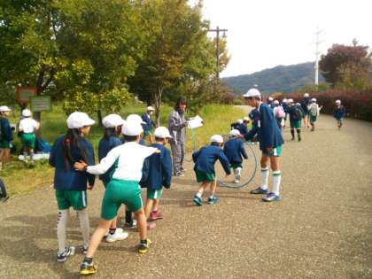 フラフープくぐり抜け。 チームワークで頑張ろう!!