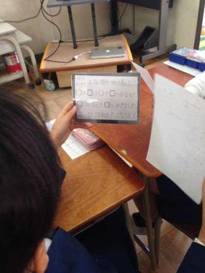 子ども達は、ICT機器に対して高い興味を示し、意欲的になります。そこで、この授業では、何人かの考えを教師がタブレットで写真に撮り、大型テレビに並べて映しました。様々な考え方に出会うことで考え方の幅が広がり、子ども達は自信を持って発表していました。
