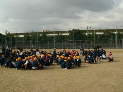 教室で休憩している時に地震が発生したら机の下にもぐり込みますが、グランドで遊んでいるには、グランドの真ん中に集まってしゃがみます。(写真左)廊下にいるときには、壁から離れてしゃがみます。