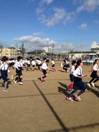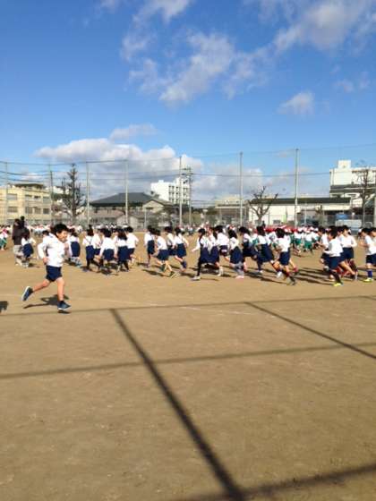 自分のペースで5分間ほど走ります。今日は1・3・5年が、明日は2・4・6年が走ります。寒さに負けず、体力を高めていってほしいと願っています。