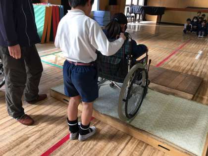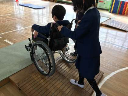 実際に車いすに乗り、段差があるとどれだけ大変か体験しました。乗っていると酔いそうになりました。最初からできないと決めつけず、「何かお手伝いできることはありませんか?」と声をかけること、いわば「心のバリアフリー」が大切とお話がありました。