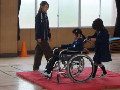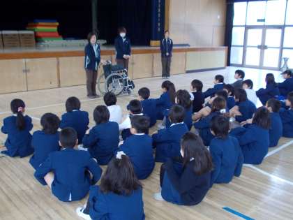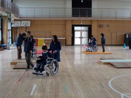 1月23日(木)校区にある「諏訪莊」の方が諏訪小学校の講堂に来て、「車いす体験」のお手伝いをしてくださいました。講堂には車いすが通るいろいろな困難なコースが作られました。子どもたちは、車いすに「乗る人」になったり「押す人」になったりして、「乗る人」の気持ちも、「押す人」の気持ちも体験することができました。