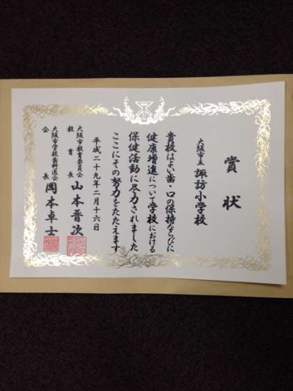 年2回の歯科検診や給食後のうがい指導など、歯と口の健康の保持増進に向けた取り組みが評価されたものです。