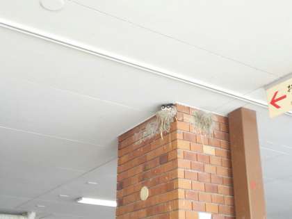 子どもたちが目ざとくつばめの巣を見つけました!! 可愛いひなたちに興味津々です。