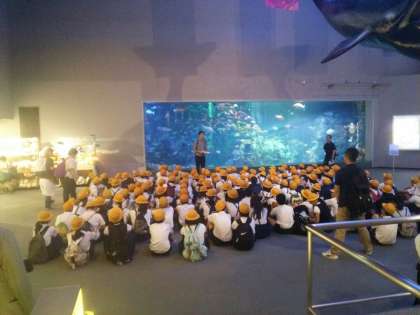 大水槽前で先生から注意事項を聞いて、いよいよ鳥羽水族館見学開始です。