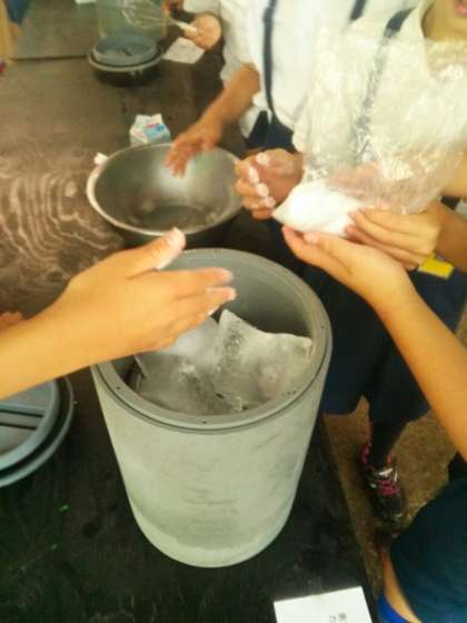 転がし用の器にアイスクリーム器を入れ、回りに氷と塩を入れてふたをします。