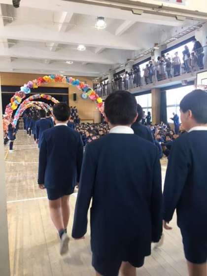 1〜5年生の拍手につつまれ、花アーチを通って入場した6年生。
