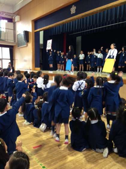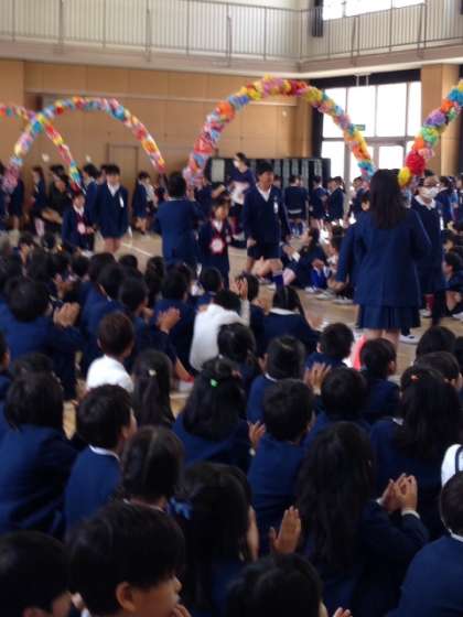 6年生に手を引かれて入場するときには、ちょっぴり緊張していた1年生でしたが、お祝いのペンダントを2年生からかけてもらって、にっこり笑顔でした。その後、いっしょにゲームをしたり、校歌を歌ってもらったりして、楽しい時を過ごしました。