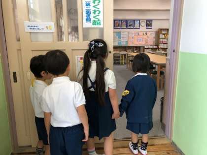 1年生と2年生で学校たんけんをしました。2年生は緊張しながら、1年生と手をつなぎ、教室の説明をしていました。お兄さんお姉さんとして、2年生は頑張っていました。1年生は、たくさん歩いて学校のことを知ることができました。