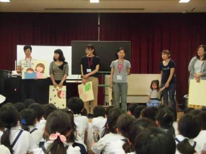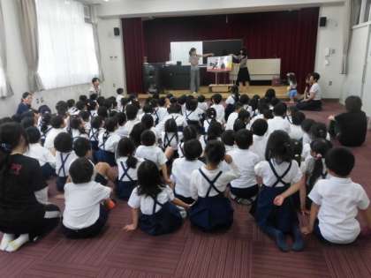 続いて、「スキップワンダーランド(読書活動支援ボランティア)」のみなさんによる絵本の読み聞かせがありました。子ども達はいっしょに声を出して、楽しく聞いていました。