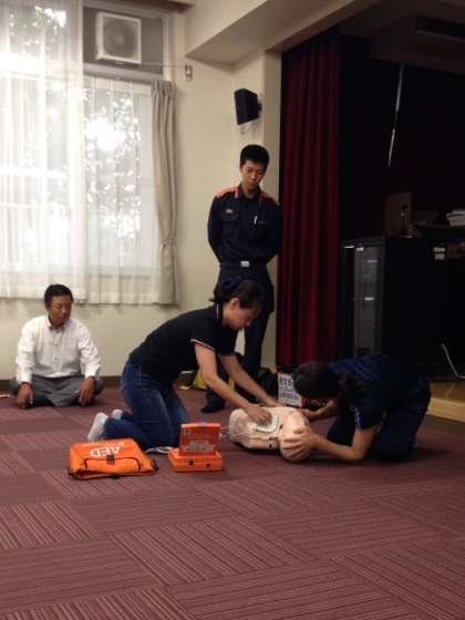 大阪市消防局から救急隊の方に来ていただいて、保護者の方とともに、応急手当の方法を教えていただきました。