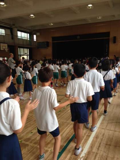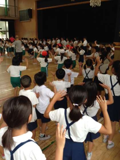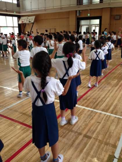 1年〜6年の希望者が対象ということで、講堂は大勢の子ども達で満員です。ドンパン節と炭坑節のおさらいをしました。だいぶ慣れてきて、上手に踊っていました。本番の盆踊り大会にはたくさん参加して、3日間の成果を披露してほしいです。